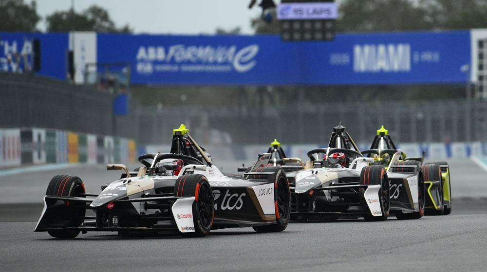 Antonio Felix da Costa var den første Jaguar-kører i spidsen af Miami E-Prix. På billedet fører han foran Mitch Evans og Drugovich i Porsche (også på billedet nedenfor) lurer bag de to for siden, efter at Jaguarerne havde skiftet plads, overbremsede og ramte Da Costa bagfra.